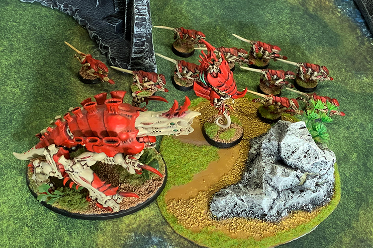 Unless you’re going with a melee-only gimmick army, it’s best to consider ranged options to combat infantry, elites, and tanks. A major benefit to the faction is all of their major ranged weapons (excepting the rupture cannon) have a static damage profile which allows you to more reliably plan how much to commit to any given target. Beyond the unit entries, there’s not a huge amount of faction-specific information for tactics here: shoot priority targets, clear blocking chaff when necessary. Noted above, but be sure to keep Share Lure in mind, reserving at least a few ranged attacks from a SYNAPSE model to tag an enemy unit you need to charge.