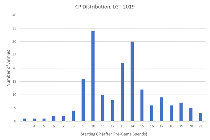 When it comes to soup vs. monofaction, about half of the lists submitted to the LGT use a single faction, and an equal split of the remaining 40% use two versus three factions when building a list. Drilling down on the factions used in each list shows that the most common CP-generating factions are still the Astra Militarum and the Adeptus Mechanicus. Chaos Daemons also make it into the bulk of armies listed as just "Chaos" and despite the new codex, Knight/Astra Militarum/Blood Angel lists are still around and kicking. After all, if it ain't broke...