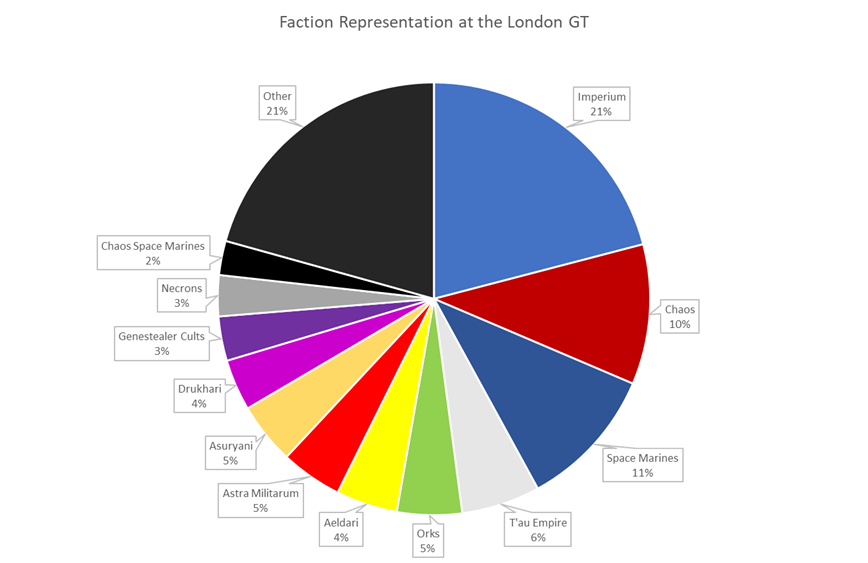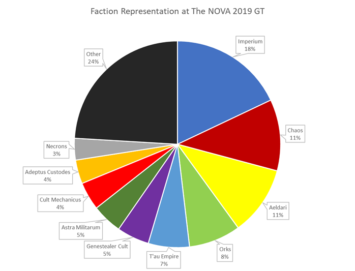 The 2019 GT had 295 active players with armies spread across 27 factions representing pretty much every mainline standalone faction in the game. Among these, Imperium (soup) armies represented the largest portion of the field, with 53 lists, or 18%. Chaos armies using a mix of Daemons and Marine factions fell in second with 33 lists at 11%, closely followed by Eldar and Eldar soup lists (32, 11%).