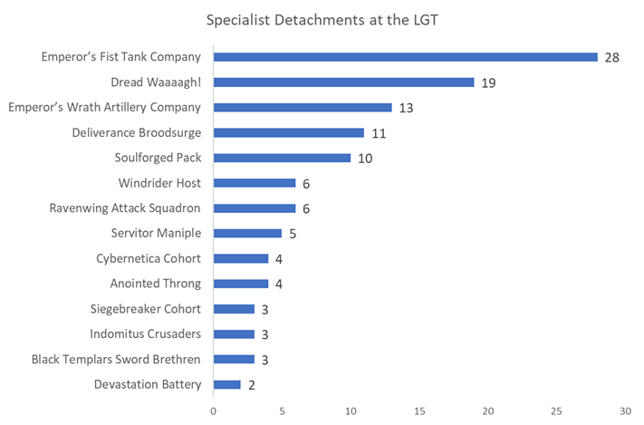 The most common Specialist Detachment in LGT lists is the Emperor's Fist Tank Company, which shows up in 28 lists. Most of these (19) also take the