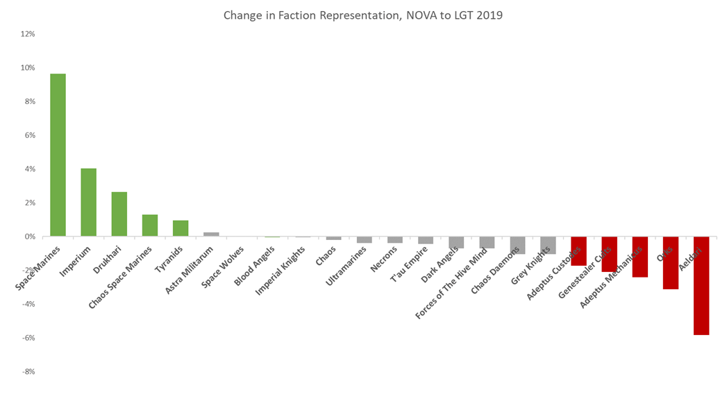 Immediately what jumps out - and should be no surprise - is that Space Marines are a much larger presence at the LGT than they were at NOVA, making up 11% of armies once you include Ultramarines and White Scars lists in the totals. While it's hard to point to one faction taking a big drop as a result, the net effect appears to have pulled most from Aeldari, Custodes, and Genestealer Cults armies.
