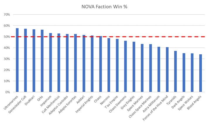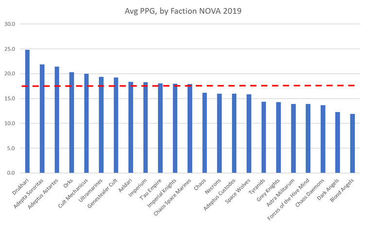 Here's where we can see that Drukhari are really in another category altogether when it comes to generating points in the NOVA format, but not necessarily in a way that translates to wins. This is the part where I have to vent my frustrations with the BCP app and how difficult it is to extra data from it; I'd love to have data on the average margin of victory and opponent points scored for each faction, but pulling that data from BCP is currently too difficult and time consuming. Instead, we can infer that Drukhari, who score the most points per game by a significant margin but do not also average the highest win rates, probably