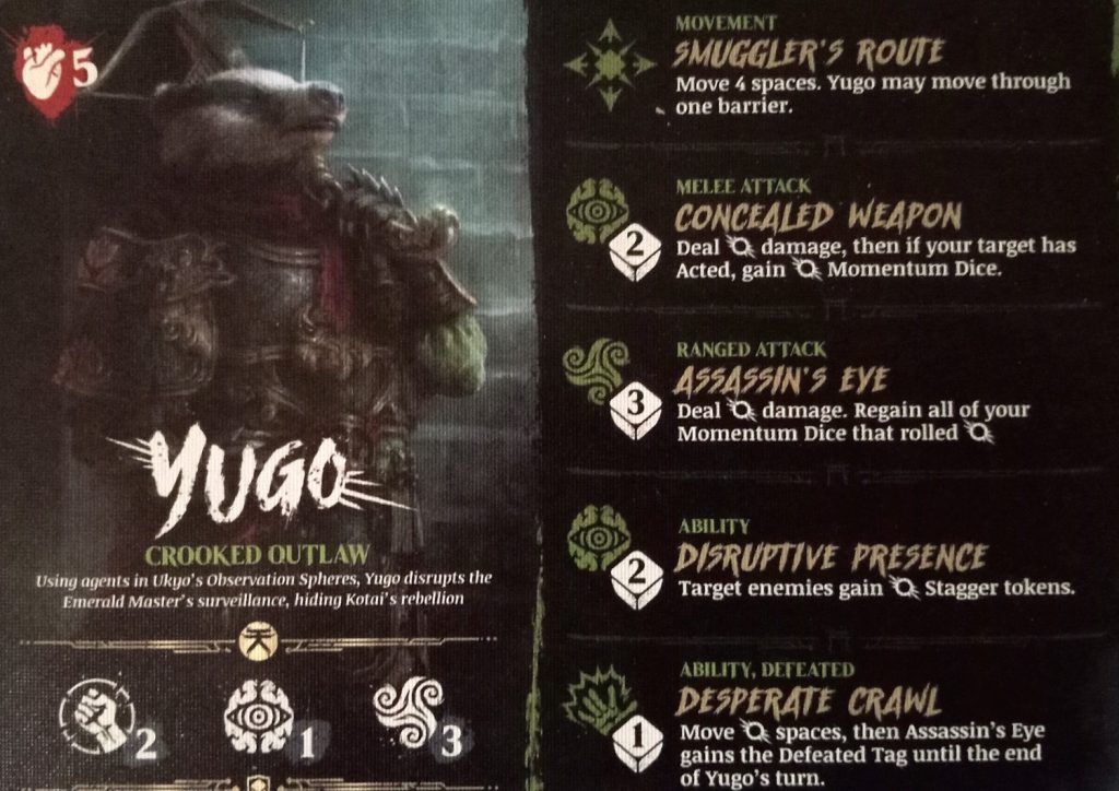 Yugo is a good Momentum farmer, between recycling Momentum dice via Assassin’s Eye, but he can also gain some with cheeky use of Concealed Weapon.