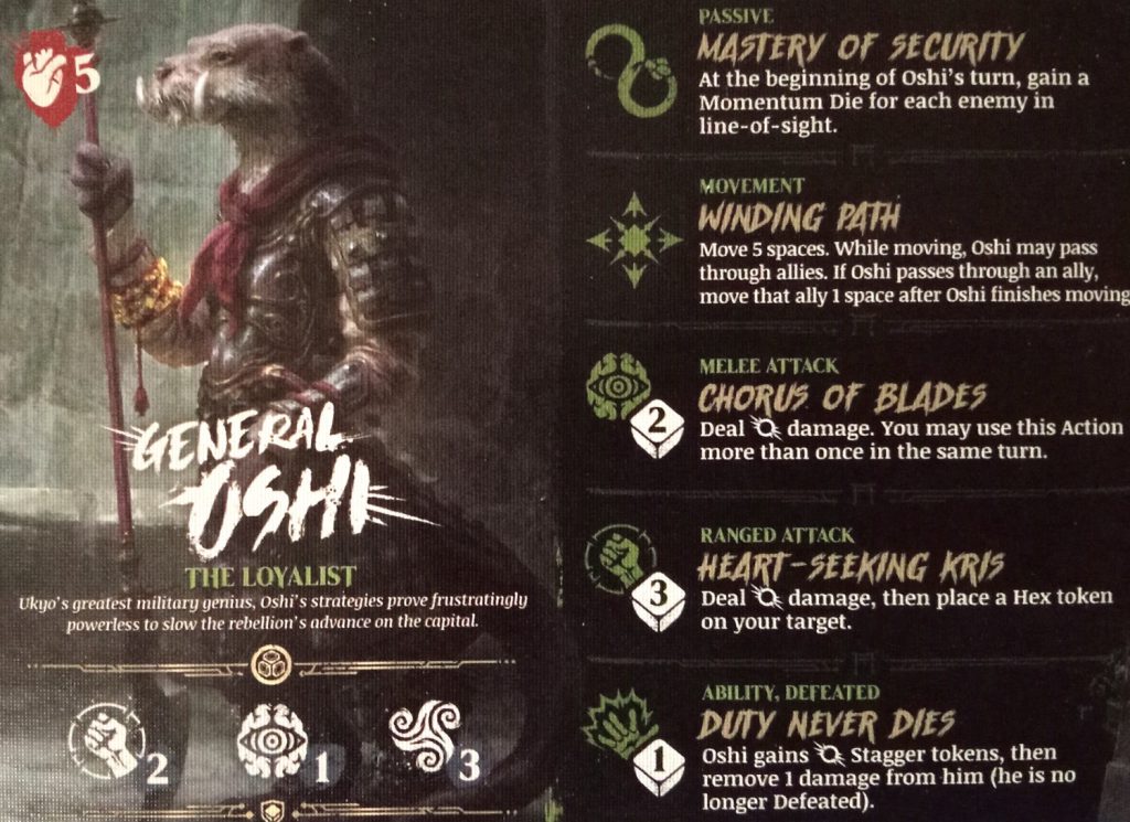 Oshi has some great mobility, with the ability to Move 5, move through friends and shift them at the end of that movement. If you’ve seen Otters running and swimming you can readily imagine why they call this Winding Path.