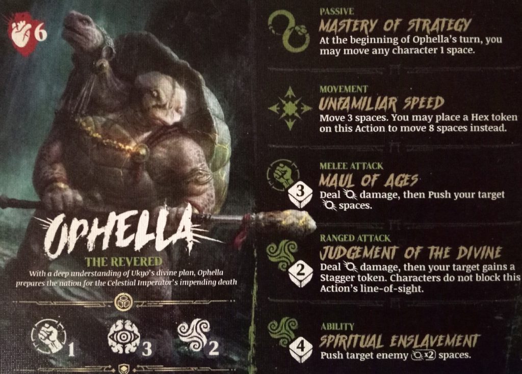 Ophella has a great suite of abilities for knocking off the last few HP of a character your opponent is desperately trying to keep away from you. Judgement of the Divine does OK damage but you can’t use characters to block LOS (this goes two-ways. Your opponent can’t hide….but Ophella can!) Spiritual Enslavement is a 4-dice Push, which is going to be a really good tool for plinking a single point of damage on someone you just want to polish off.