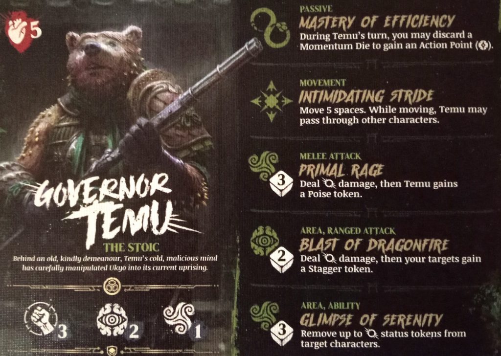 The downside to having so many awesome abilities is that Governor Temu wants to be spending Momentum but not only does he have no special means of farming it, he’s quite likely to have burned a Momentum point at the start of his activation. So, you really need to plan to have one more Momentum each turn than other teams might be able to manage.