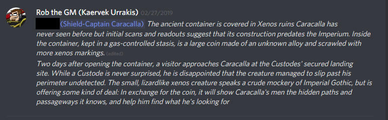 Additionally, I decided to turn Relic and Ally discoveries into more of a roleplaying opportunity, setting up some quick events in our campaign Discord after each game win involving a relic. One example is the Slann ally Babajide, whom our Custodes player Felime won after beating Macathu’s Death Guard. Rather than just give Felime the ally, I instead described him finding an odd coin that led to the ally approaching him, and gave him a choice of whether to work with the Slann as a guide: