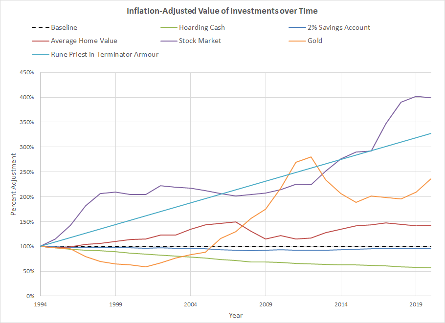 As we enter these uncertain times one must think towards the future, and making wise financial investments is a key part of establishing a financial bedrock. Hopefully by now we all understand that leaving money under a mattress (or even in a low yield savings account) is a bad investment; relative to the inevitable onslaught of inflation our money will only decrease in value. But how should an enterprising hobbyist allocate their funds? Is it possible that Warhammer is not only a sound investment in fun, but also of finances? Let's do the math. Before making any investments, it's important to make sure your own financial circumstances are well in order. Things like taking care of high interest debts and having an emergency fund are good first steps. The Personal Finance subreddit has
