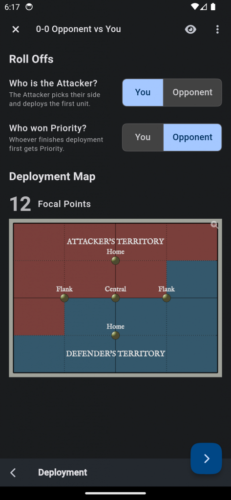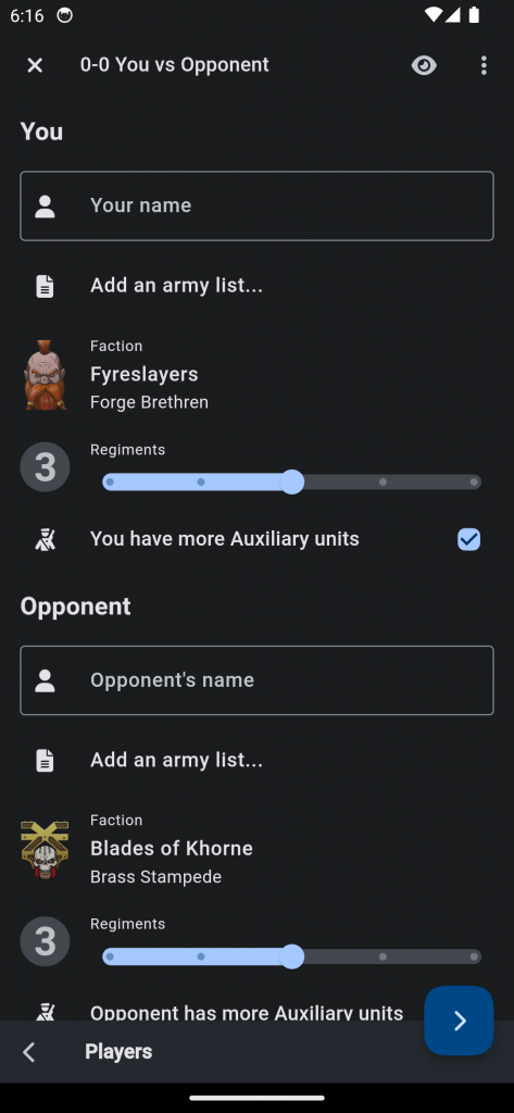 We've added in support for every faction in the game, same as last edition, with the ability to add army lists for you and the opponent. In this section you can also pick your regiment totals and note whether you or your opponent have more Auxiliary units, affecting your starting CP total.