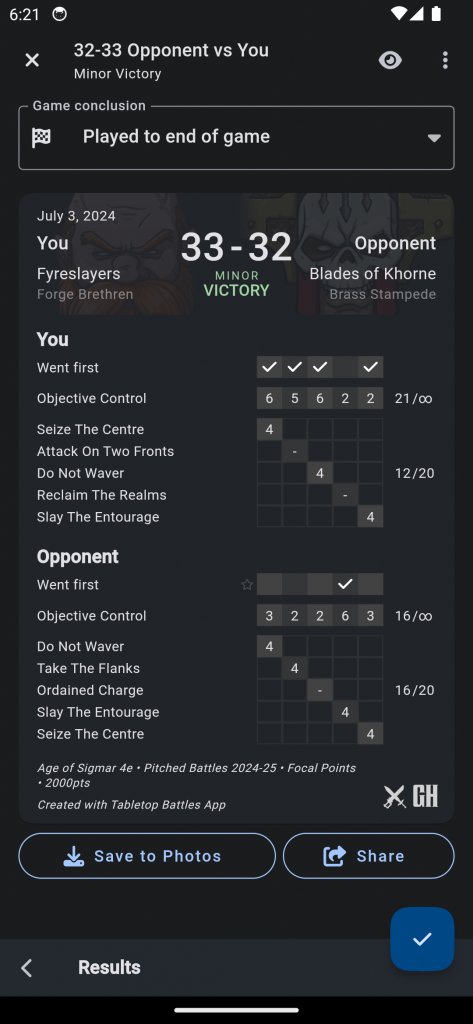 Game Link function, which will tell you when your score and CP totals don't match up with your opponent's, giving you a head's up when it might be time to compare notes and make sure you're both on the same page. During set up you can also set the battle size, pick the kind of scoring you want to use (standard, WTC, or AOSFF), and choose whether you want the app to remind you to take photos.