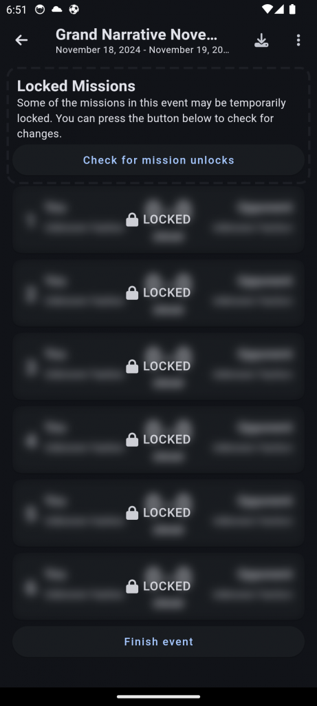 Locked? That's right, the missions for the 2024 Grand Narrative will be hidden until they're revealed LIVE to players at the Grand Narrative. So you'll discover the missions as they become available. Or if you're playing this in the future after the event has ended, they'll just already be unlocked. So that's good too.