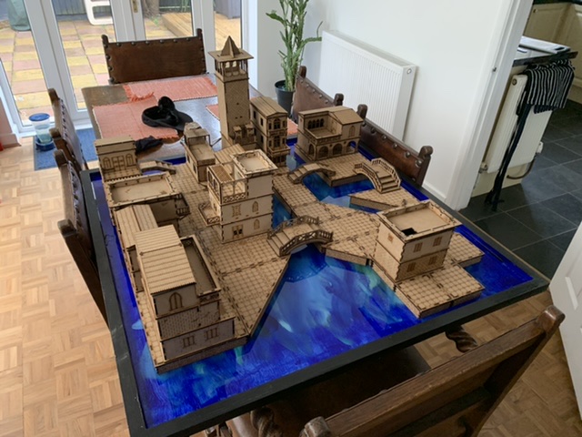 In my first article I laid the foundations, or in this case canals, for our journey around Venice and with the resin cured I began work on the Streets of Venice. This was a lot of cutting, I really can’t overstate how much cutting was involved here. The MDF bridges that join the streets to the rest of the sheet were fairly thick and to prevent damaging the pieces I cut each one individually, sacrificing a couple of box cutter blade tips in the process. Now this was my first time working with any significant amount of MDF and I was assured this was pretty normal, so I think a lot of my shock was down to my own stupidity of cutting out almost every street piece over the course of two sittings. I also earned a sizable blister in the process.