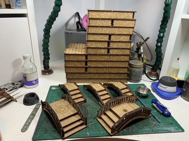 My excitement to see it all on the table quickly carried me through to the bridges, and again you get a generous number for linking the various pieces of your board together. I really liked the variety here, with three basic bridges and two much fancier ones and as I put the kits together my mind began whirring with possible paint jobs to elevate them from my planned basic coating of light grey ink. It’s worth raising here that as the bridges are slightly more complex kits taking the time to dry fit certainly doesn’t hurt and in the process I realised there was a step missing. Just compare the pieces you have to the store image and you’ll be fine. The Ringhiera Bridge feels like a much more modern kit, with far finer MDF bridges joining it to the wider sheet which made removing the pieces much easier. When you come to the Stretto Bridge you’re going to need to trim it down, or at least I did. The pieces that sit under the steps were too long, causing everything to sit out of alignment so with a box cutter in hand and my safety glasses on, I resized everything. Seriously wear some safety glasses, I almost caught a piece of MDF in the eye and that’s what prompted me to put mine on.