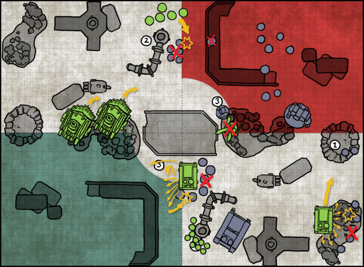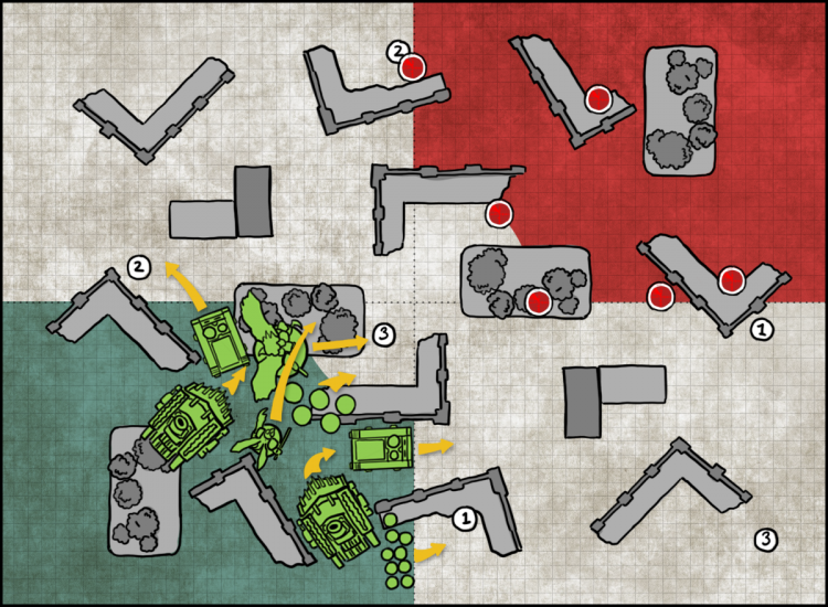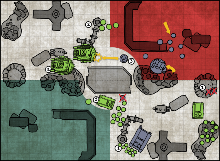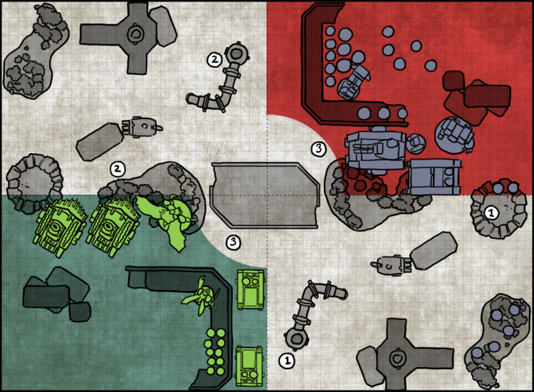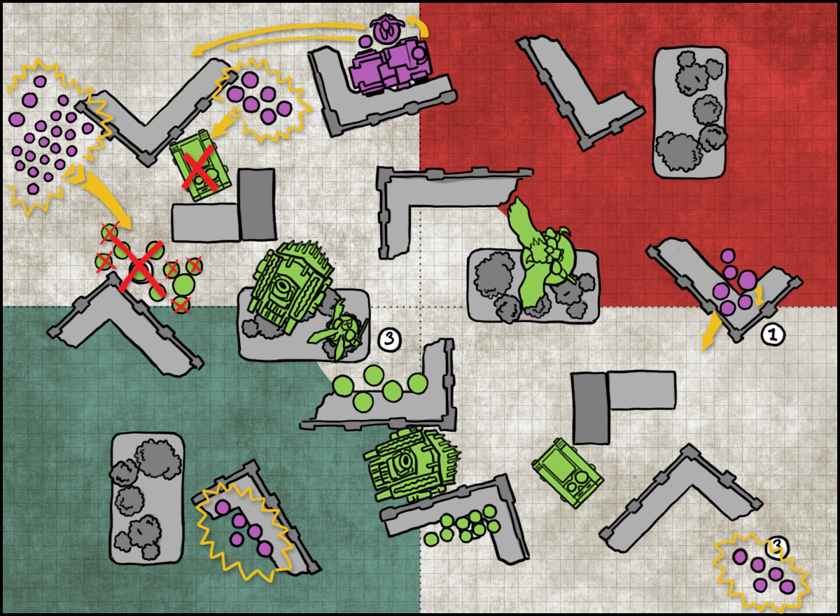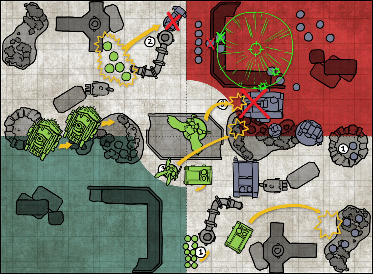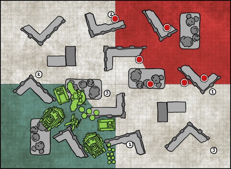 - Raid: Hold objectives/attack positions within your opponent’s territory (half of the board).