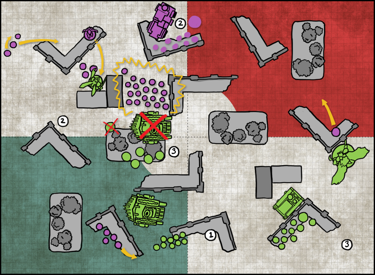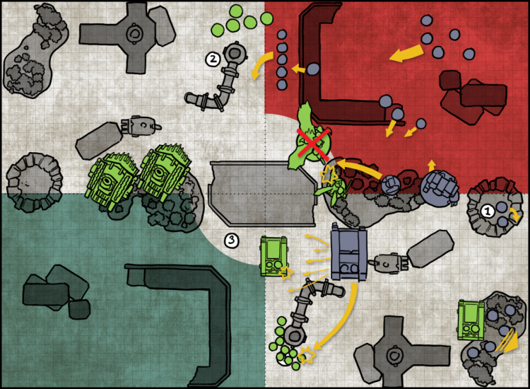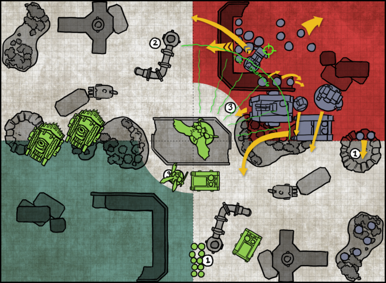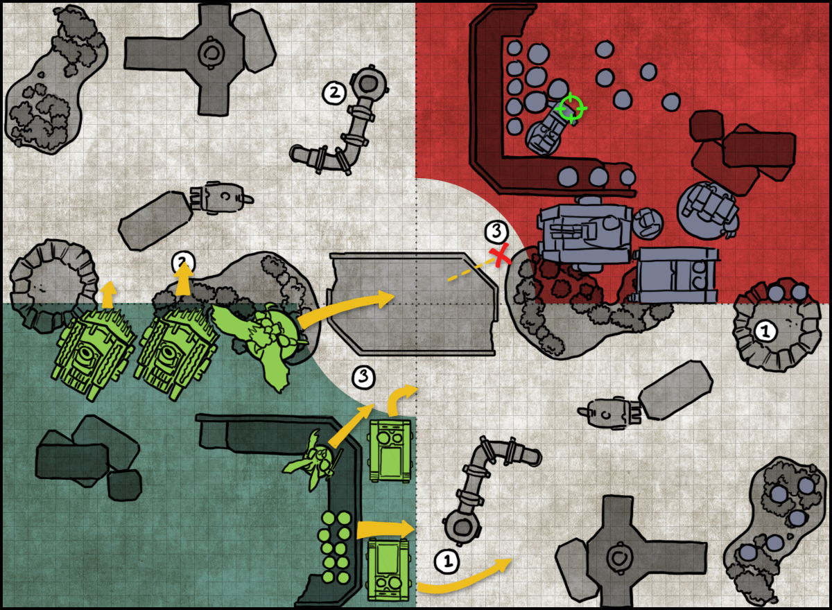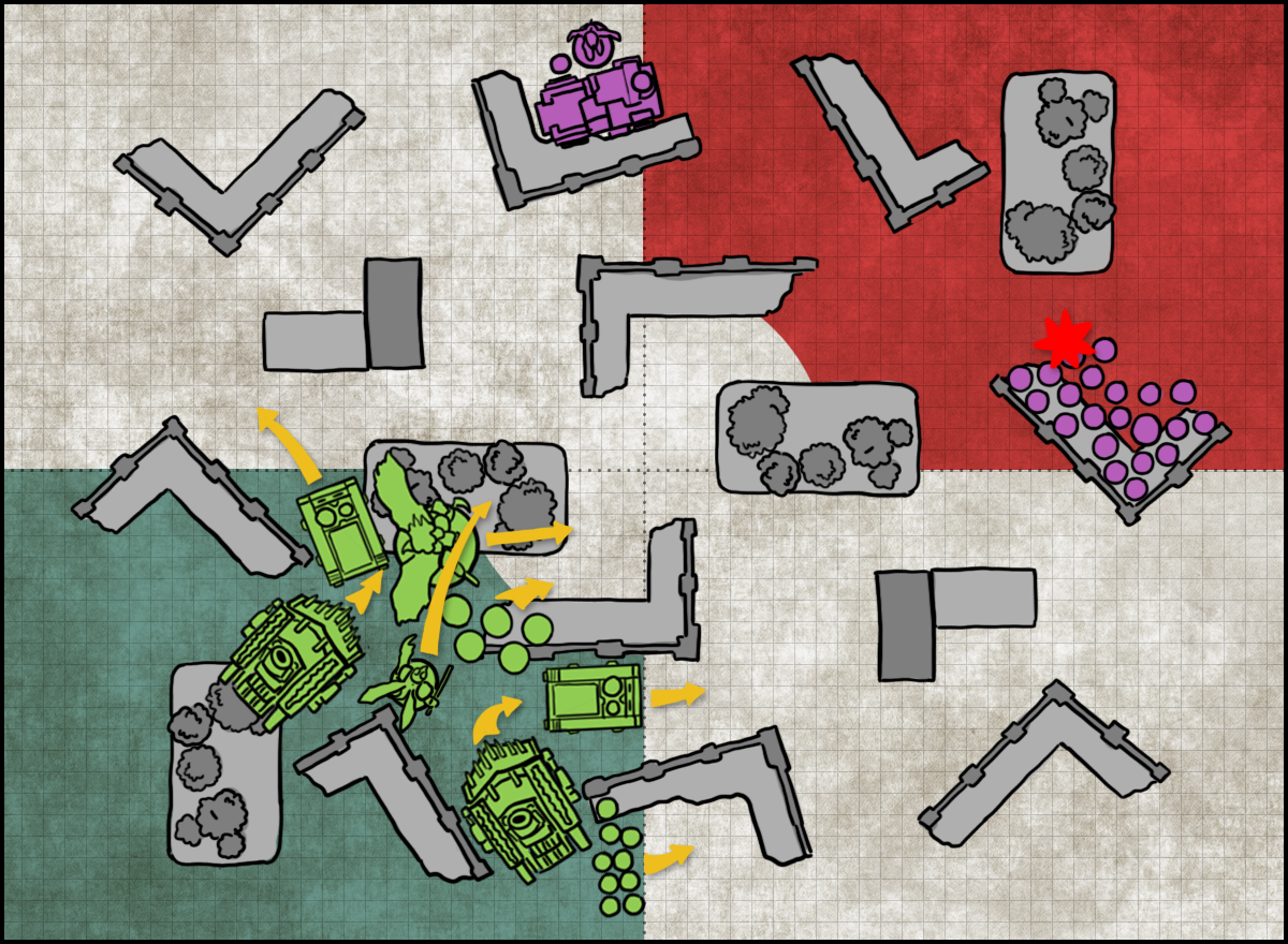- Raid: Hold objectives/attack positions within your opponent’s territory (half of the board).