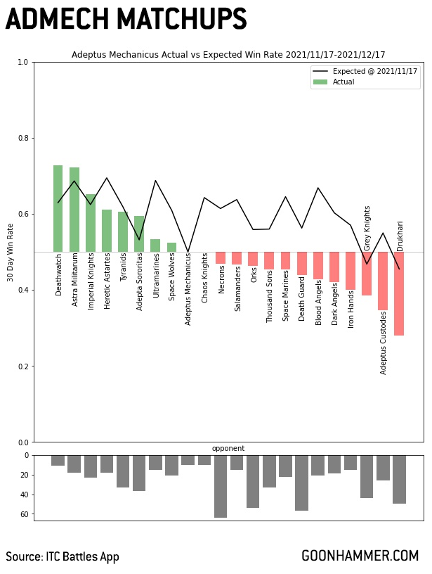 For our final faction look, we'll kick Admech one more time while it's down. Here expected vs. actual scores pretty much tell the whole story - the Admech underperformed their expected performance against 17 of the game's factions following the balance dataslate, and against the game's best factions. They have pretty even win rates against a large number still, but having major negative matchups against Custodes, Drukhari, and Grey Knights takes them out of the game.
