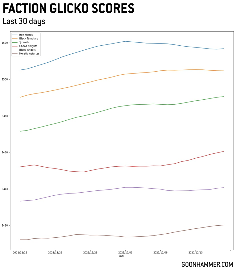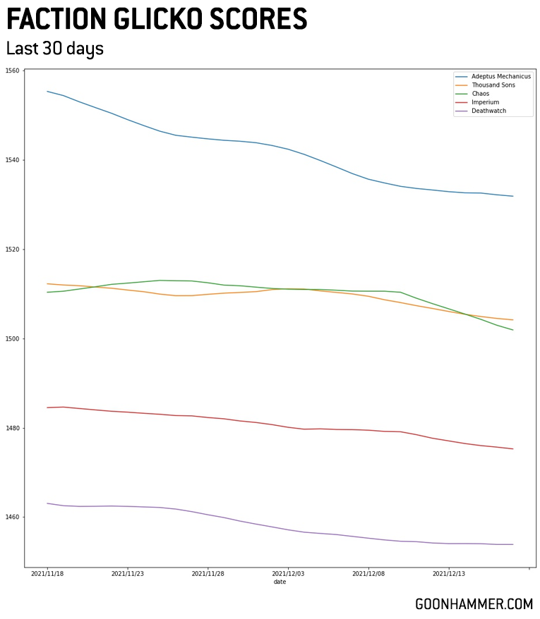 The precipitous fall of the Adeptus Mechanicus should come as no surprise here - the Balance Dataslate was much-needed, but took a heavy hatchet to the faction, leaving them merely average in a world where Drukhari continue to exist. They dropped nearly 20 points following the dataslate, and will likely continue to fall until their glicko scores are more in-line with their win rate. Deathwatch have also fallen despite some new rules in the form of an Army of Renown.