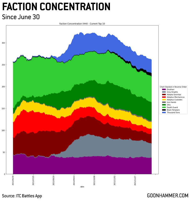 The net impact of this is that Admech armies are quickly vanishing, while Drukhari armies have held constant. Death Guard play has declined as the faction has continued to fall off, and Grey Knights are holding fairly steady as a top option now. Iron Hands are now also on the rise, though expect Tyranids (or at least Forces of the Hive Mind) to make a play at cracking this soon, and expect Custodes to double in size after their book releases in January.
