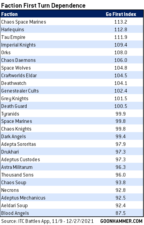 Which factions depend the most on going first for their wins? We can find this by looking at the percentage of a faction's wins that came in games where they had the first turn, and then index that against the average for all factions (note that here a score of 100 is average).