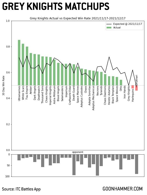 Grey Knights are likewise sitting very pretty in the standings in terms of win rates and Glicko scores, and do particularly well against marines of most flavors - only Iron Hands seem to match up well against them. In that regard, they've only got one fewer positive matchups than Drukhari, but it's worth noting that one of the Grey Knights' negative matchups is against Drukhari, which is why they're still sitting at #2.