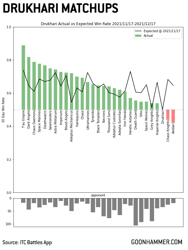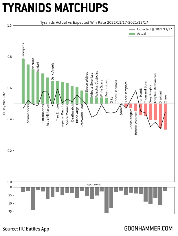 With that out of the way, the good news is that Tyranids have more positive matchups than before, reflected in their rising Glicko scores and where they've outperformed expectation, particularly against Necrons, Dark Angels, Marines of most flavors, Knights, Custodes, Sororitas, Orks, and Death Guard. That's some impressive improvement against a large number of armies. The bad news is they appear to still have negative matchups against several top armies, including Drukhari, Iron Hands, and Grey Knights, and those have been in-line with their projected performance.