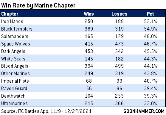 40kstats.com for some results data and to look at lists. It’s as large and complete a dataset as you could ever ask for for 40k. This month’s data specifically comes from the period ending on December 18th, 2021. The data contains tens of thousands of games worth of data from the ITC Battles app and Best Coast Pairings.
