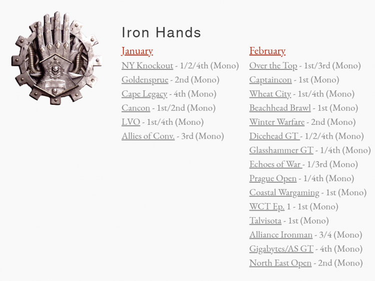iam: It’s great to look at the data from the brief post-FAQ window; looking at the five events on 40kStats from March 14th/15th (a mix of ETC and ITC style scoring) shows all of Chaos Marines, Thousand Sons, Sisters, Tau, Grey Knights, Blood Angels, Tyranids, GSC, Orks, Eldar, Imperial Knights, Astra Militarum (in soup) and Adeptus Mechanicus hitting top 4s, with a single stray Iron Hands/Blood Angels soup list in there too. That is a lot of faction diversity compared to even one month beforehand, when multiple events have 2 or even 3 Iron Hands in the top 4.
