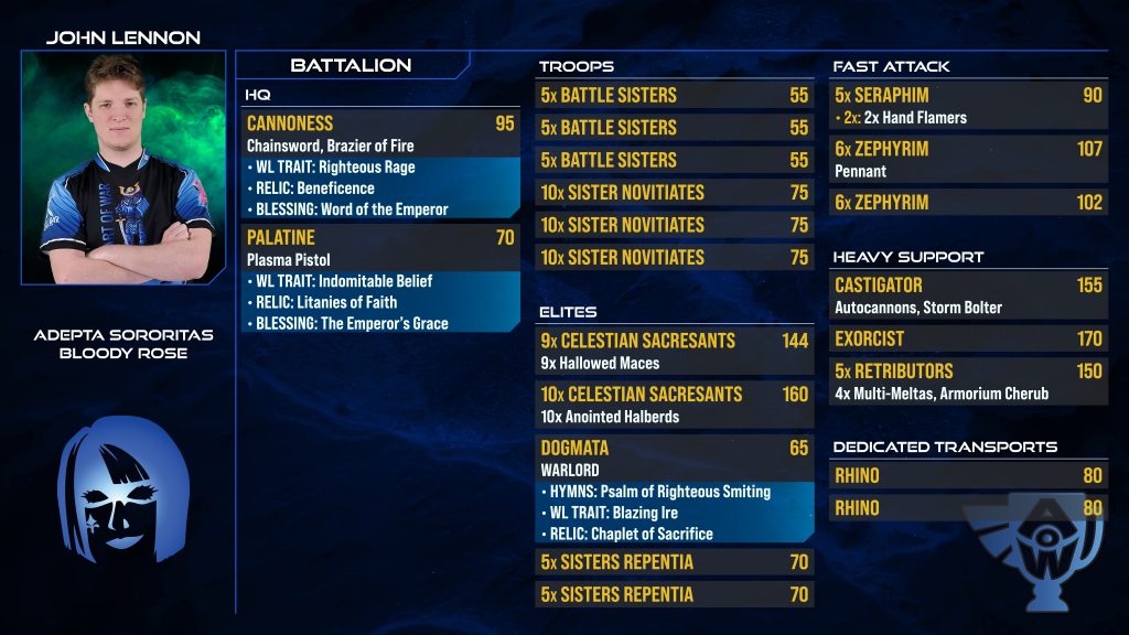 Both Sisters and Drukhari are in flux right now, adapting to recent changes. For Sisters, points changes on various key units and no longer being able to mix Orders has sent many players back to the drawing board, and what John is playing here is distinctly new. Both Novitiates and the advent of a Codex Supplement have handed the Bloody Rose some new options to build with, and this army leans into that pretty heavily. Novitiate units look very