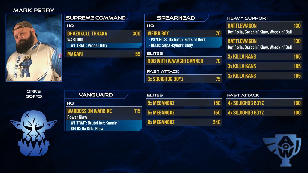 Mark's list here is a very cool spin on Goffs, and really shows off the savings that are available to Orks with the Nachmund points if they take the right stuff. A Goff Waaagh turn is one of the scariest melee pushes out there, especially when it's buffed by Ghazgkhull, and this list looks designed to ensure that the Orks suffer fewer losses to opposing shooting than they normally might while buidling up to that, ensuring that they hit in force. Battlewagons are far from indestructible, but each at least demands real commitment to take down, reducing the number of things left to shoot at the more valuable stuff inside, and potentially drawing firepower away from Ghaz or the Kans.