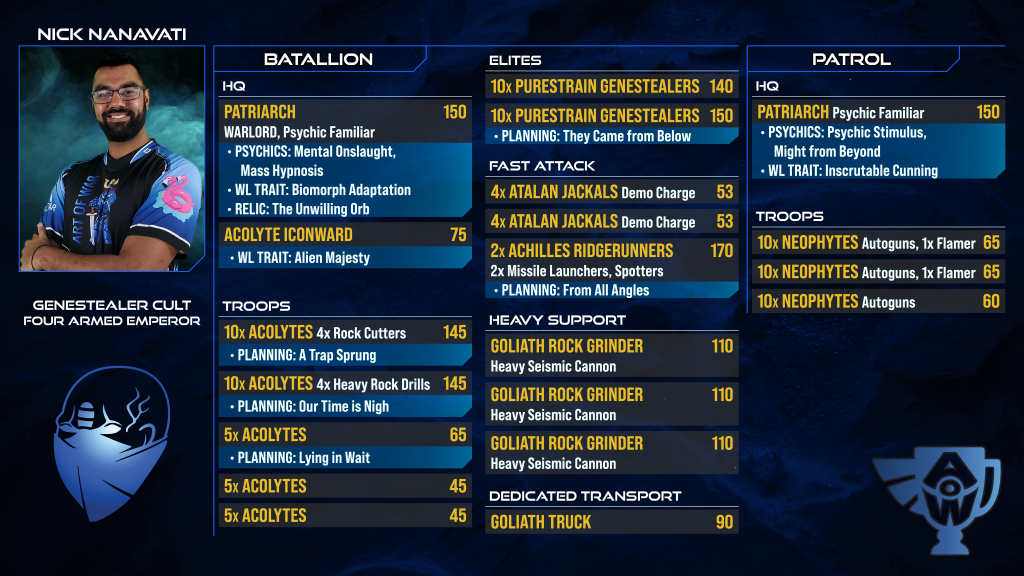 On Nick's side we see what's genuinely a pretty well balanced Genestealer list, using a mixture of the high pressure plays like