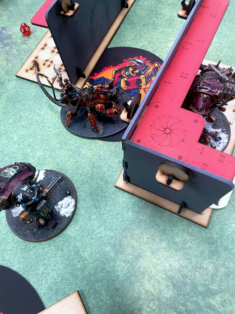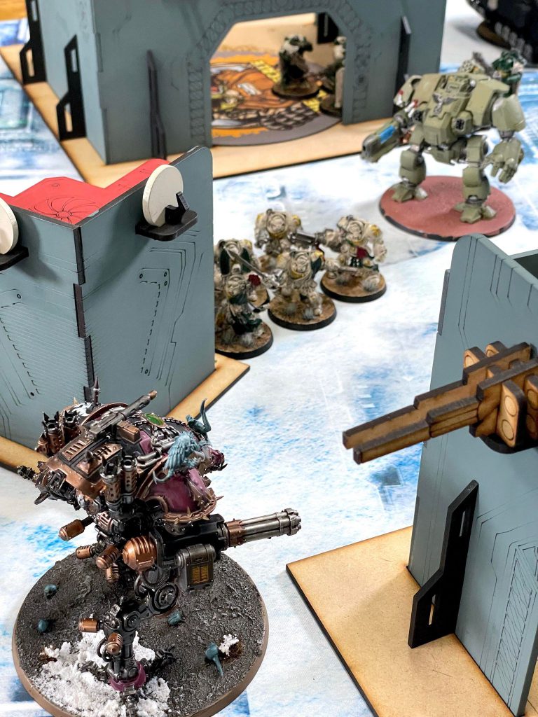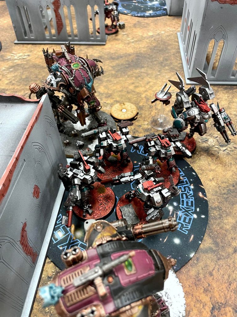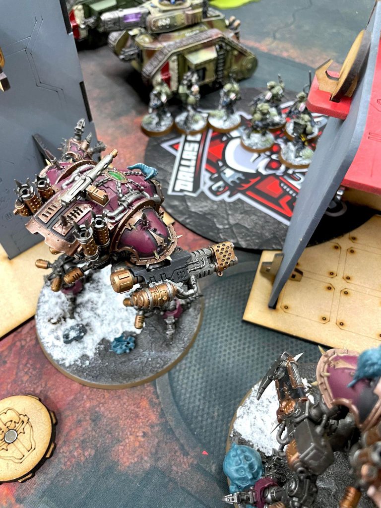 Relic Contemptor Dreadnought [8 PL, -3CP, 195pts]: Cyclone missile launcher [25pts], Merciless Logic, Stratagem: Hero of the Chapter [-1CP], Stratagem: March of the Ancients [-1CP], 2x Twin volkite culverin [30pts]