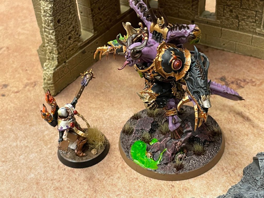 Before we get into the games from this cycle, let’s talk about the leader of the Warhost of the Soulbound, Malioch Soulbinder. He’s been doing prettywell for himself, and gotten some attention and favor from Slaanesh. I like the cut of the Dark Prince’s gib, so the Warhost has been steadily falling further and further under Slaaneshi influence and seeking greater glory in the name of perfection, excess, and the Warmaster. So much glory in fact, that Malioch earns himself a little upgrade and
