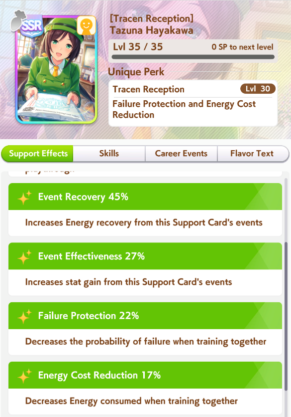 Another suggestion is that Friend Cards, especially Tazuna, can be extremely valuable to runs for “moody” trainees, because her events often provide free Mood Up events and restore energy. The way Friend cards work is that after training with them enough, their Friendship Gague hitting Orange unlocks Recreations you can do with that specific Friend. Each of these events restores a lot of Energy, provides other benefits like free stats, and can even cure negative ailments like Night Owl or Slacker; Tazuna is the better of the two available, but either her or Kiryuin are good choices if you want to smooth out your runs; they also provide end of career stat boosts that rival those of the Chairwoman if the card bond is maxed, as a final reward to using them.