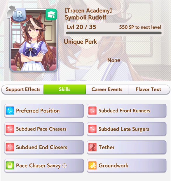 Groundwork is considered an absolutely required skill for Sprint and Mile trainees who run in front, like Seiun Sky.