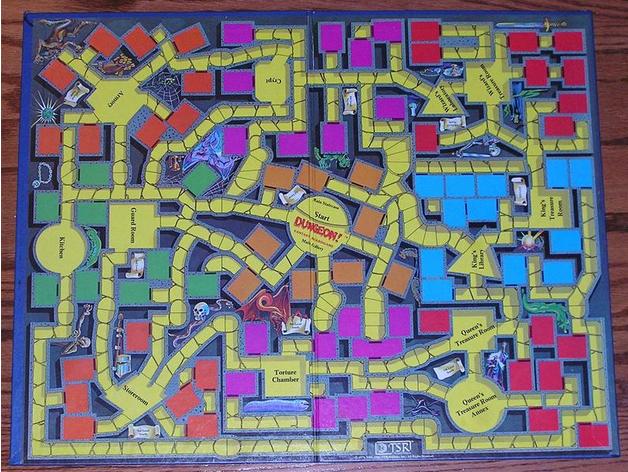 A year after TSR published Dungeons & Dragons they published Dungeon!, a dungeon-crawling adventure game designed to simulate the experience of D&D. The game features a giant dungeon maze board and players take on the role of heroes (Elf, Hero, Superhero, Wizard), exploring the dungeon, dodging traps and fighting monsters. Players start in the middle of the board and as they move they’ll find secret doors and traps, rolling 2d6 to attack and trying to hit target numbers to hit defeat monsters which appear and drawing treasure cards based on the level of the enemy. The game feels quite a bit like a proto-HeroQuest or Talisman, albeit without a Zargon. It’s a game which holds up well and has been reprinted and revised many times.