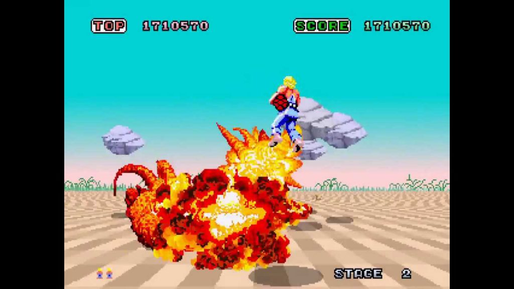 Sega introduced this rail shooter arcade game in October, 1985. In Space Harrier players take on the role of a jetpack-wearing soldier zooming across sci-fi/fantasy landscapes and taking out massive monsters (most notably, one-eyed wooly mammoths). One of the first and most successful 16-bit arcade games, Space Harrier almost single-handedly birthed the rail shooter genre, and it still looks great today with its massive sprites and pseudo-3d graphics.