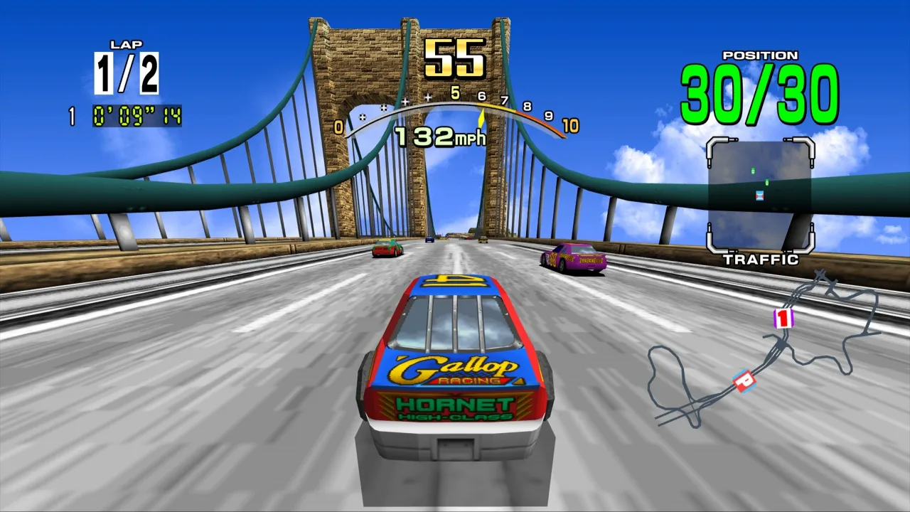 Possibly the most famous arcade racer ever made, Sega’s Daytona USA debuted in arcades in March 1994 and immediately blew away the competition, topping sales charts in ‘94 and ‘95. In similar fashion to Virtua Fighter 2, the game added texture mapping to its graphics and dramatically improved on Virtua Racing’s visuals. The game was a blast to play and was the first game to use the Sega Model 2 arcade system board.
