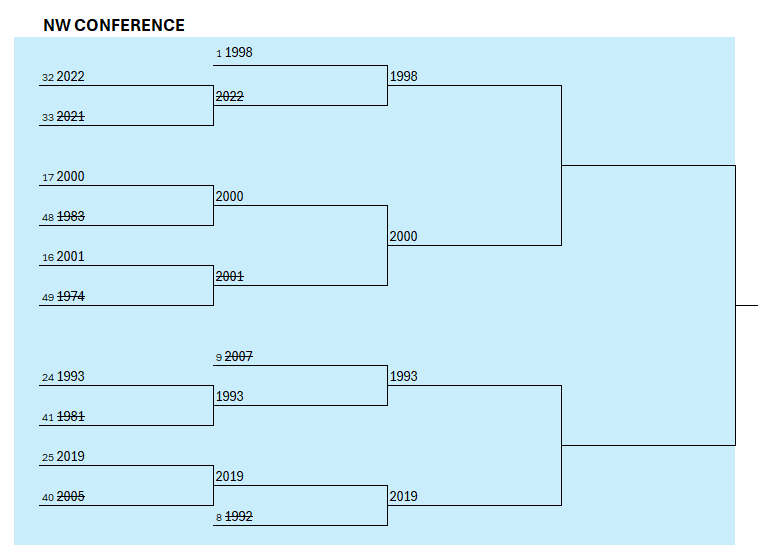 Today we're returning to the Northwest Conference for our Sweet Sixteen matchups. Our first matchup here has 1998 taking on 2000 in what's likely to be a little bit closer than the 2022 matchup, but only in the sense that people will wince a little bit more as they pass over 2000 for 1998.