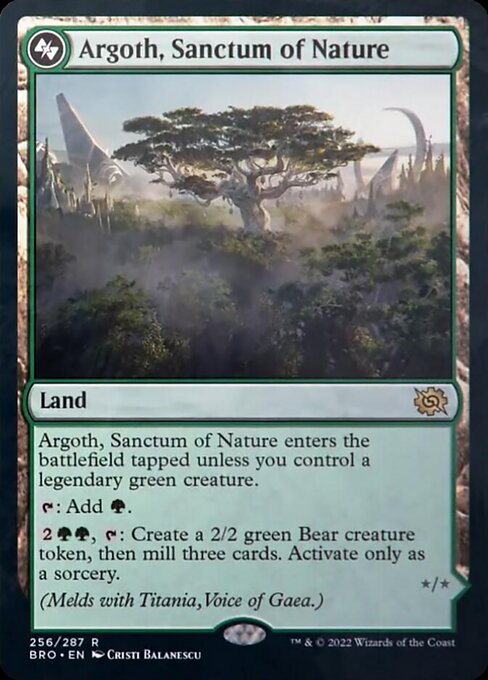 Loxi: I wonder if there was discussion over if this could be a forest or not. Would this be too strong if you could tutor it easier due to that? Regardless, I think this is a fine land that is ok on its own if you don't have the meld ready to go on board, but I wouldn't run without Titania. Since it's a land that has a nice little activated effect and can even enter untapped in other decks though, it makes it a pretty low opportunity cost.