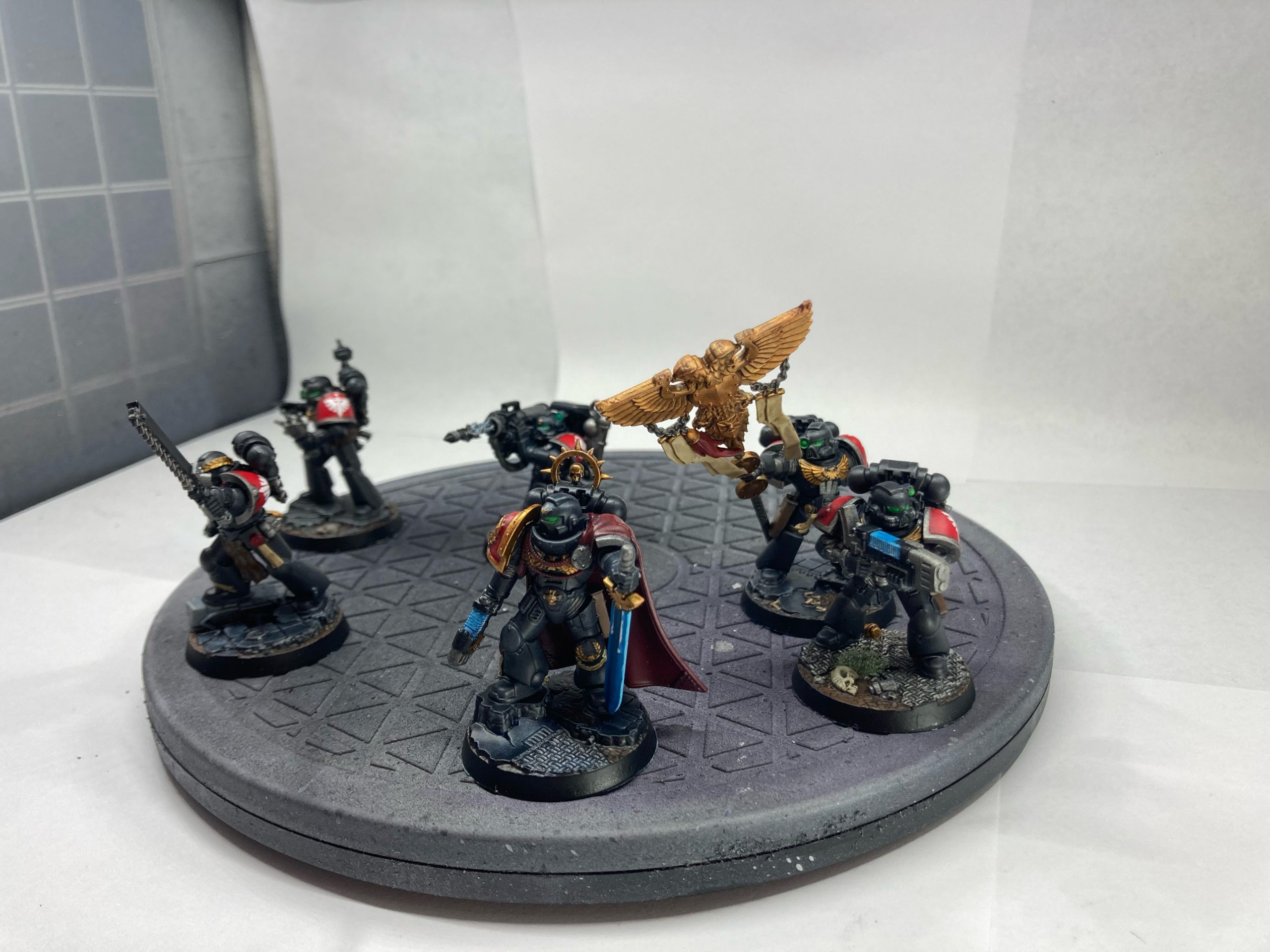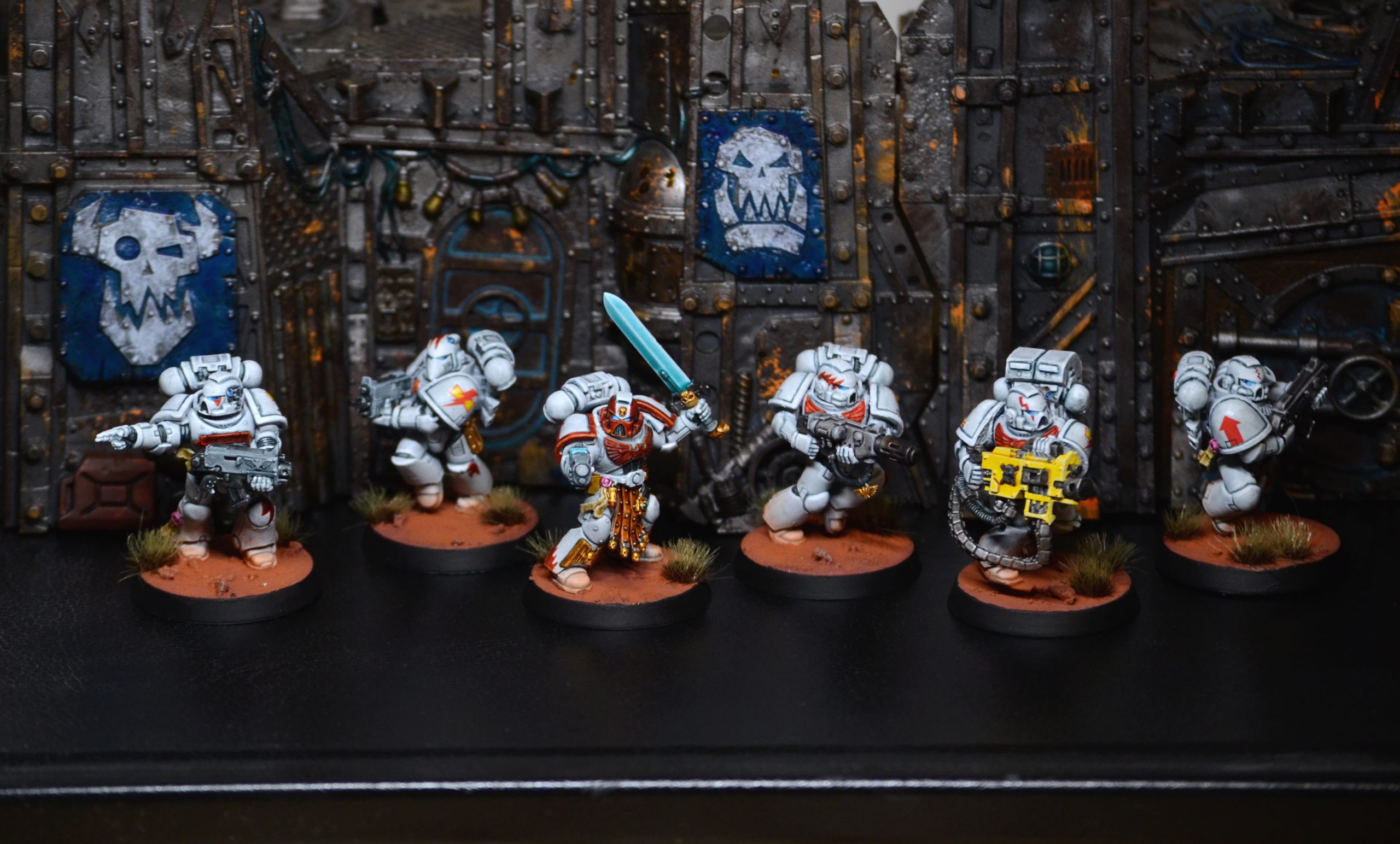 For the kill team, I challenged myself to learn how to paint white well, while making do with the bits I had available. I have owned some of the bits and the transfers since the late 90s, so they've been in storage until I started the hobby again in 2020. Other bits have been donated or traded. The heavy bolter guy is actually metal, from an ancient Devastator kit. The only part of the models I bought new for this project are the bases. I was actually amazed that the transfers were still good. Although my "main" chapter is Primaris and I love newer models, the team made me appreciate the flexibility and classic look of firstborn kits again.