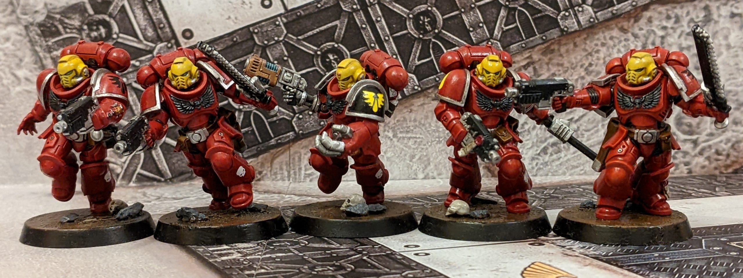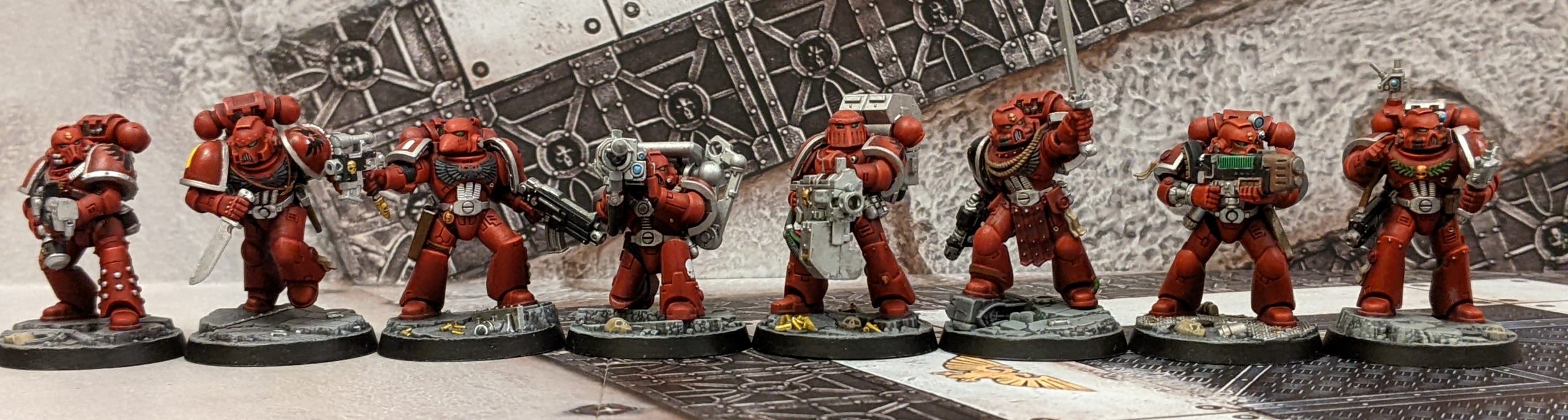 I actually really enjoyed these, and it made me enthusiastic about painting standard marines again. They're just a bit bigger than the old tactical marines to look a lot better. There are some minor conversions (sergeants chainsword becomes a power sword, a couple of headswaps to have a marine in Mk3 plate and helmet and a marine in Mk6 armour) and I think they add to the character of the squad.