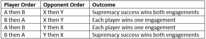 In the simplest terms, there is a 50% chance of an even trade where each player gets to strike first in an engagement. Alternatively, there is a 50% chance that whoever wins the Supremacy roll will get to strike first in both engagements, a potentially game changing advantage to the winner. In theory, this means you should only have a bad outcome one in four times where your opponent activates first in both engagements.