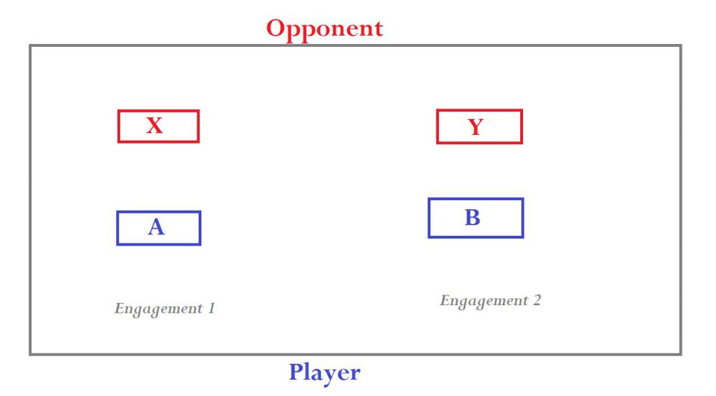 In the above example, you and your opponent own two Regiments (A and B vs X and Y respectively) each who are matched off against each other. You both want to activate each Regiment one after the other and need to decide the best order. There are four possible outcomes shown in the table below, before factoring in the Supremacy Roll.