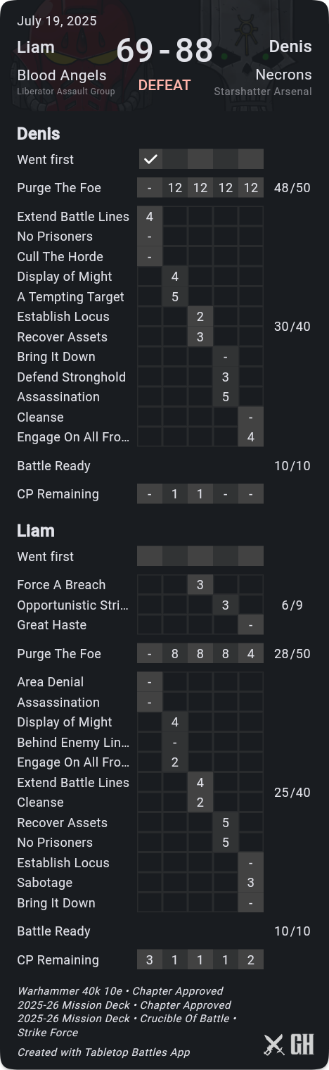 On my turn 3, I picked up the second Deathshroud brick, and the second Lord of Contagion lay dead on the ground because it was the same battle round as the other one had hit the dirt and he couldn't re-use the ability. From there it was pretty much game over - he had a reasonable number of assets left, but had no chance of scoring anything he drew with them, and I now had the run of the board.