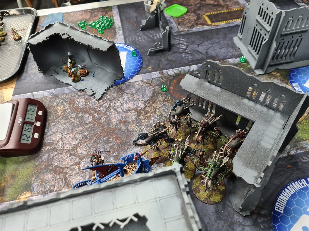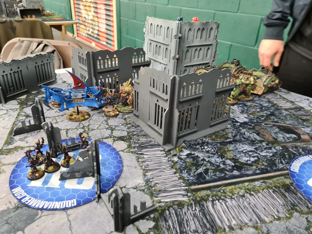 I went first and decided to play like a complete chump. Drazhar and two units of Incubi jumped out of their boats in an attempt to charge the Blightspawn and Daemon Prince, and while two units managed it even through the -2" stratagem I didn't even roll for the third one because they were unlikely to make it, despite there being no reason they shouldn't at least roll the dice? As was predictable I didn't manage to do enough to them, and on turn 1 I lost Draz and 10 Incubi in return.