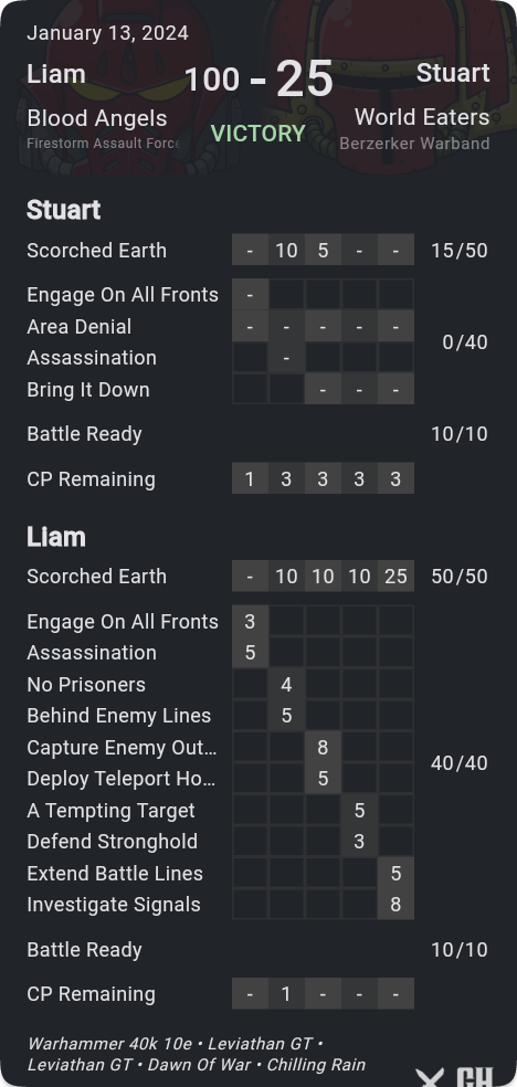 A perfectly respectable if unexciting record, and yes I'm distinguishing between Space Marines and Blood Angels; I built and painted a whole separate army, so it counts. The highlights of these events were getting to play Greg Chamberlain (LGT) and Nassim Fouchane (Leicester), both of whom I've known for a while but hadn't ever been across the table from. Both are also strong players who brutally destroyed me with armies I hadn't yet played against in 10th (Leagues of Votann/World Eaters), so it was educational all-round.