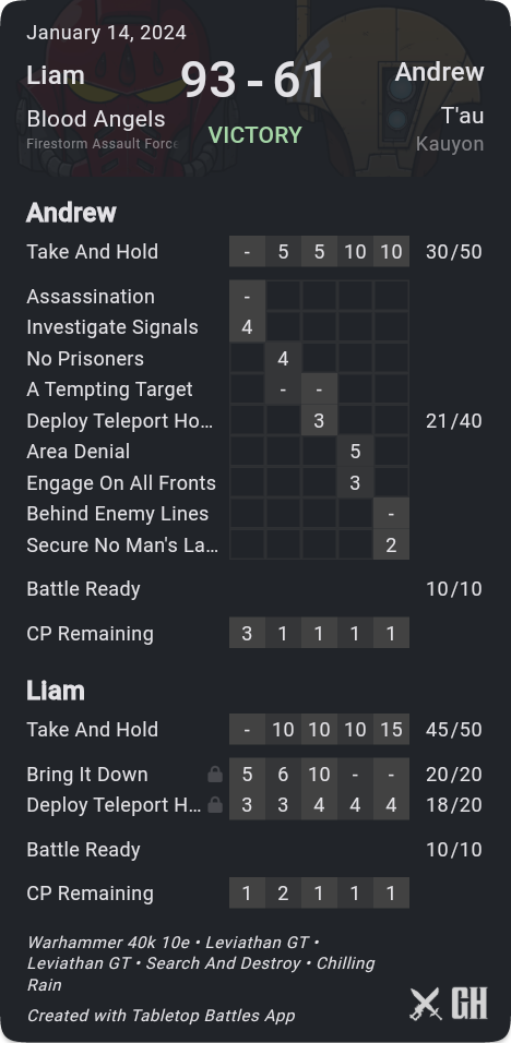 With the set-up of the game already against him, Andrew then wins the first turn, which he absolutely doesn't want. He draws Investigate Signals and responds by having Shadowsun cover his back corner and pushing one of his Devilfish to my bottom-right corner and jumping the Breachers out to score 4pts on it, and that's about all he has available to do. On my turn 1, the Death Company leap across, charge and kill the Ghostkeel, and tag the Devilfish and Breachers (killing 7 of them in the process). The plan is working - he only scores 5 on primary this turn, and he's down a Ghostkeel and most of an infantry unit he might have wanted to cycle on to this to try and keep up the scoring tempo.