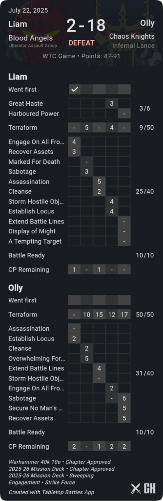 From here the game turned around on me pretty quickly. Olly picked up all of the Bladeguard and Dante's squad of Sanguinary Guard, and although he didn't finish off the Death Company completely he did kill Lemartes via the Abominant using the Epic Challenge Stratagem to Precision him out. I was able to kill both the wounded Knights in my turn 3, but again missed the kill on his second Abominant on his home objective, which ended any hope of closing the scores up.
