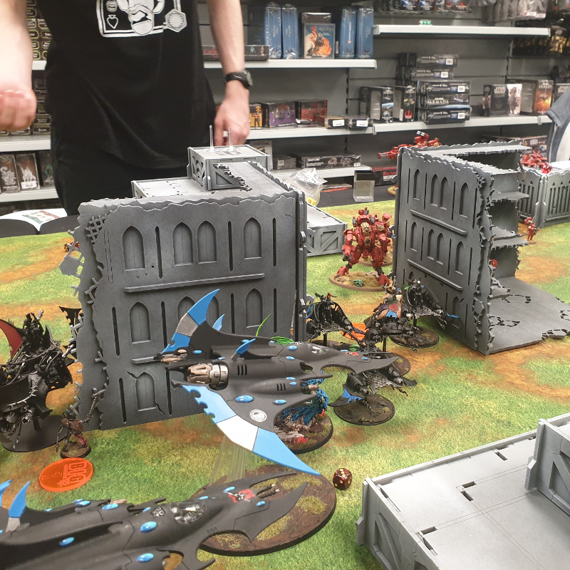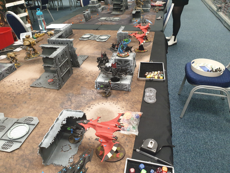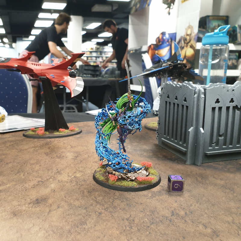 In practice, I kept fucking up and it showed. Joe had board control for a huge chunk of the game thanks to the Talos sitting in midfield daring me to come out and fight them. I forgot to claim a second objective on turn 1 by like half an inch, letting him have hold more. I left my Archon where the Solitaire could get at it and was only saved by a key Perils of the Warp stopping his Shadowseer from casting Twilight Pathways at the vital moment. I forgot to yeet the Yncarne out of harm’s way, and let it get killed pointlessly. Late in the game, I mismeasured an objective again (or more likely, didn’t measure at all and just moved lazily) and missed out on hold more and the bonus point. The game went all the way to 6, when my Crimson Hunters just managed to kill off a single Death Jester (good job, guys) and Boots him, earning me 4pts and ending the game 30-28.