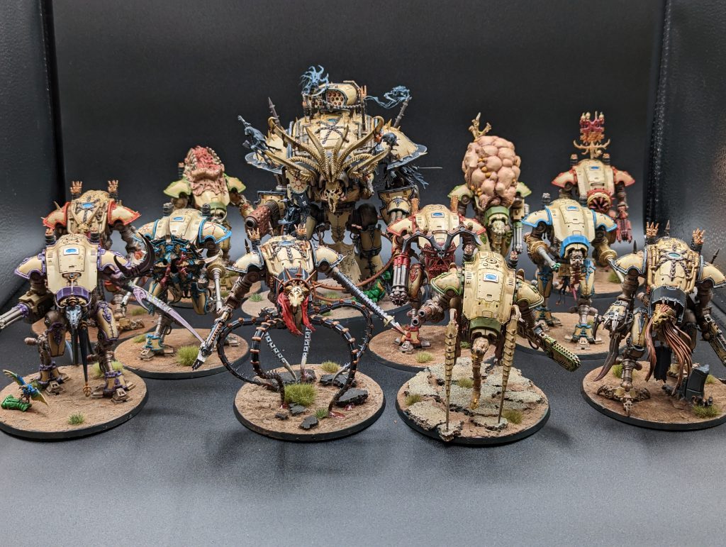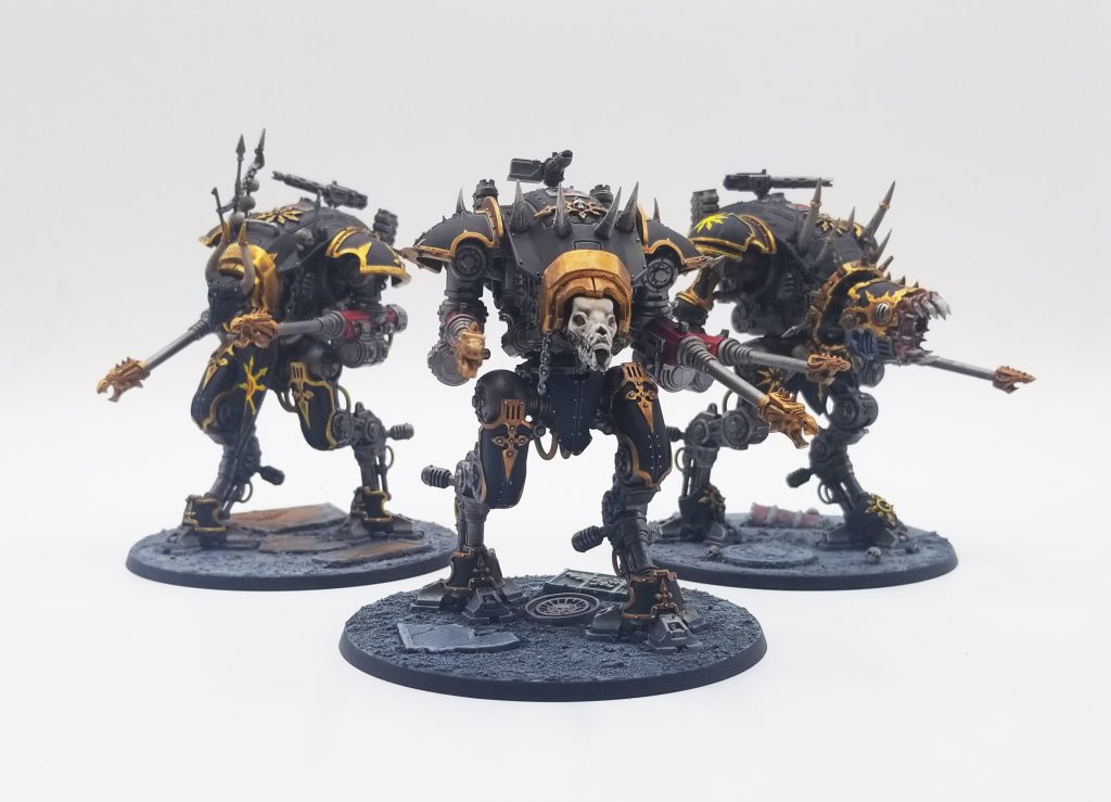 The Idolators Offerings are battle traits available to your bigger stompy titanic units and each offering is assigned to a part of the Knight’s chassis: When you pick an upgrade from this list, you start by choosing to upgrade your Knight’s Legs, Arms, Torso, or Head. Each unit can only have one upgrade from each category but you can use the Vile Reworking Requisition (1 RP) to switch out parts you no longer want.